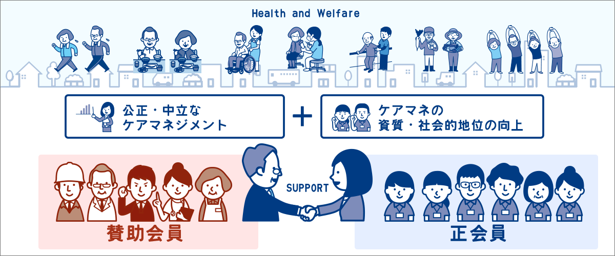 香川県介護支援専門員協議会では、賛助会員制度を設けています。「正会員であるケアマネージャーの資質向上のための活動を通じて地域包括ケアシステムの拡充を図る」という私たちの理念に賛同いただいた多くの個人・団体が賛助会員として、様々な形でサポートをして下さっており、私たちの活動の基盤となっています。